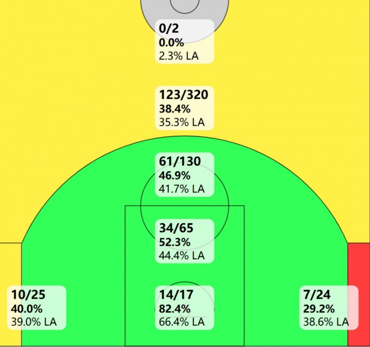 美媒晒出了保罗上赛季的投篮热图,他上赛季在三分线内的各个区域命中率都高于联盟平均水平,82场比赛篮下仅出手17次,但命中率14个,命中率高达82.4%,远高于联盟平均的66.4%。