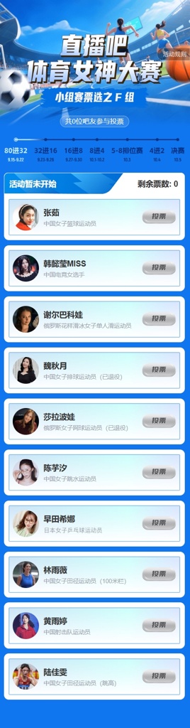 本次小组赛共分为8个小组,每组10名候选者,共80位体育女神参与角逐。