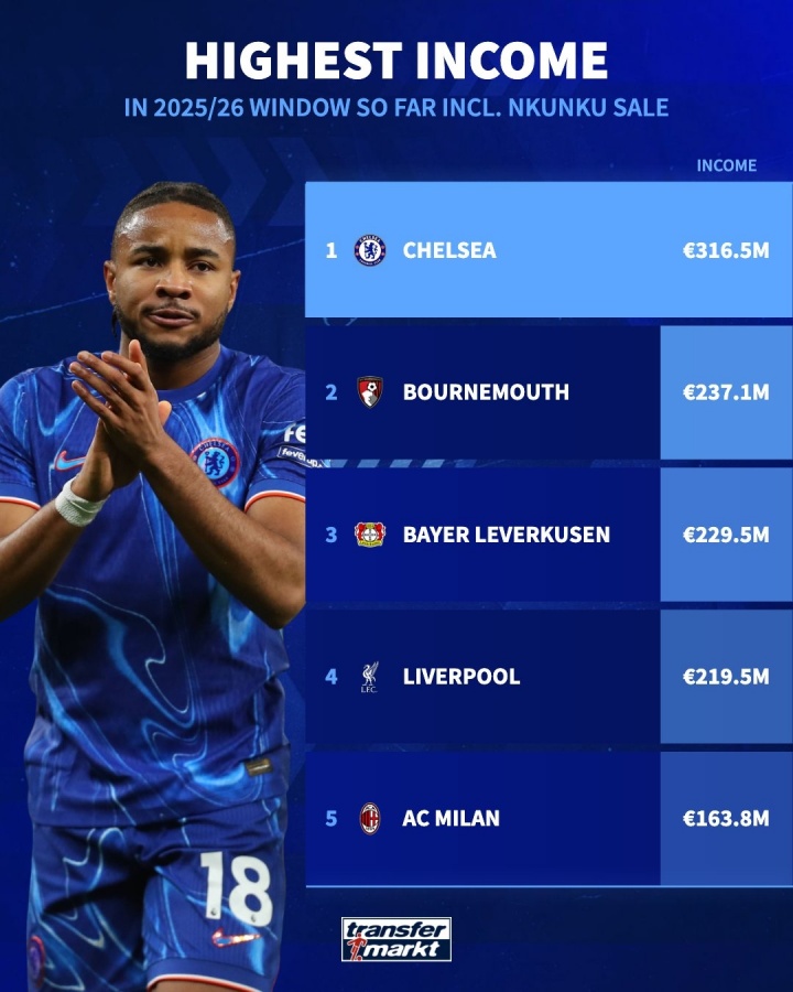 08月28日讯 据多家媒体消息,恩昆库即将以超过4000万欧元转会费加盟米兰,据德转统计,切尔西今夏卖人总收入将达到3.165亿欧元,冠绝全欧,比卖人榜第二位的伯恩茅斯多了近8000万欧元。