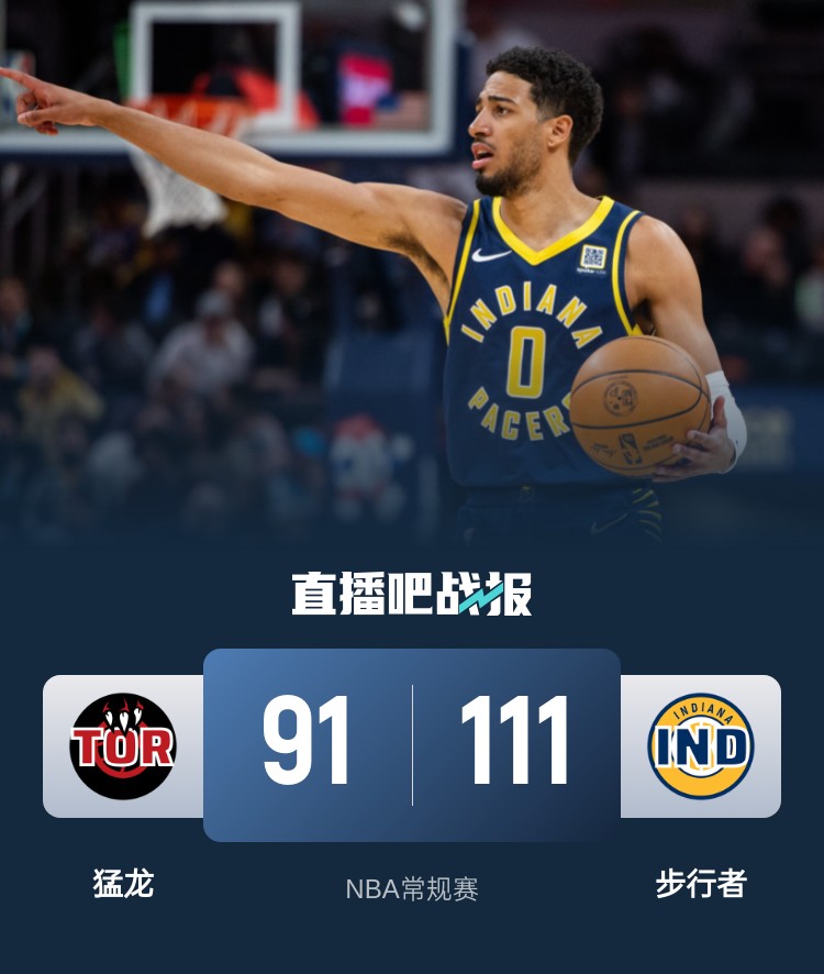 开场后两队连续在外线对飚三分,哈利伯顿手感火热帮助步行者取得领先,他单节射落12分,猛龙依靠冲击内线咬住比分。第二节虽然猛龙上来先声夺人将比分反超,但随后他们命中率下降,步行者重新夺回领先,哈利伯顿和西亚卡姆轮番拿分扩大领先优势。易边再战,哈利伯顿延续火热状态依旧频频拿分,步行者在他的带领下将分差拉大到两位数。最后一节奎克利带队追分,不过哈利伯顿和特纳轮番轰进三分扑灭猛龙反扑势头,随后分差被拉大到20分以上,最终步行者111-91轻松击败猛龙。