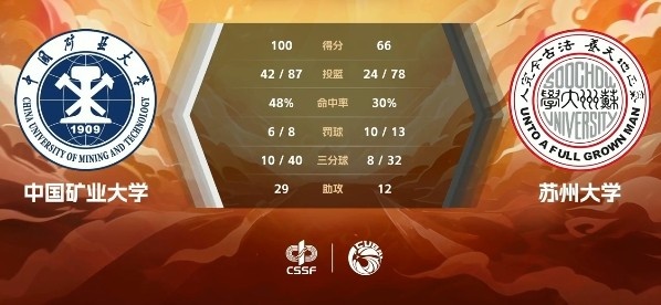 末节,中国矿大继续打入内线拿分,苏州大学命中三分止血,中国矿大进攻端状态不错打得游刃有余,苏州大学则进攻始终手感不佳,场上分差被拉大到30分以上,最终中国矿大100-66大胜苏州大学。