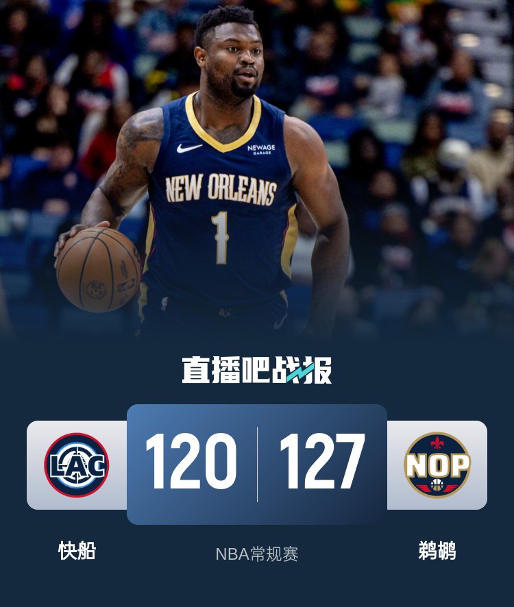 鹈鹕(18-48):麦科勒姆23分3板7助3断、锡安22分10板12助、墨菲21分4板3助2断、马特科维奇15分4板1助2帽、阿尔瓦拉多14分2板4助2断、布鲁斯-布朗12分5板5助、霍金斯11分3板1助、米西9分8板1助2帽、班巴7板