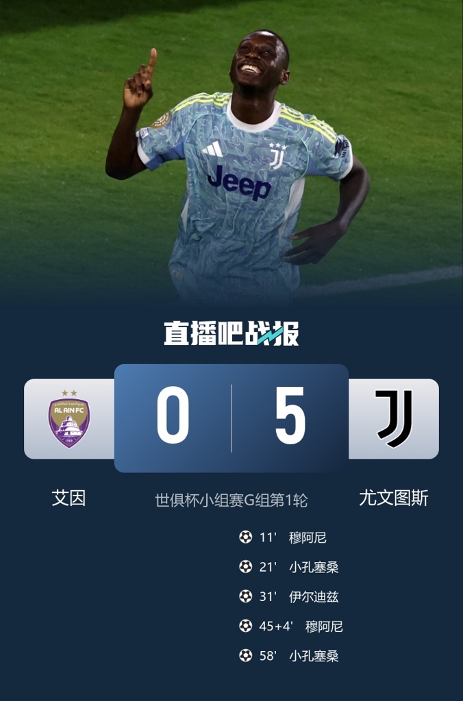 6月19日讯 北京时间9:00,世俱杯小组赛G组第1轮艾因vs尤文图斯,比赛在奥迪体育场打响!上半场,阿尔贝托-科斯塔助攻穆阿尼破门,随后再为小孔塞桑送上助攻!后者抽射破门!伊尔迪兹内切远射再下一城;半场补时阶段,凯夫伦-图拉姆同样助攻双响,穆阿尼梅开二度!下半场,拉比亚扳回一球但是越位无效;小孔塞桑内切爆破同样完成双响!道格拉斯-路易斯远射中柱!最终,尤文5-0大胜艾因!取得世俱杯开门红!