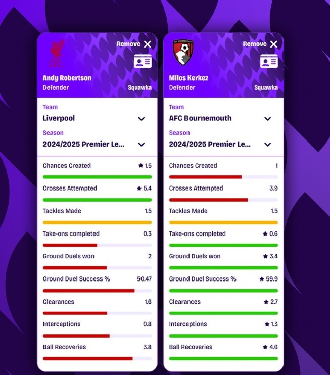 6月24日讯 伯恩茅斯后卫科尔克兹即将加盟利物浦,他预计会和罗伯逊争夺左后卫首发位置。Squawka对比了两人2024-25赛季在英超赛场上每90分钟的数据,除了在创造机会和尝试传中方面,科尔克兹在其他多项数据方面都处在领先。