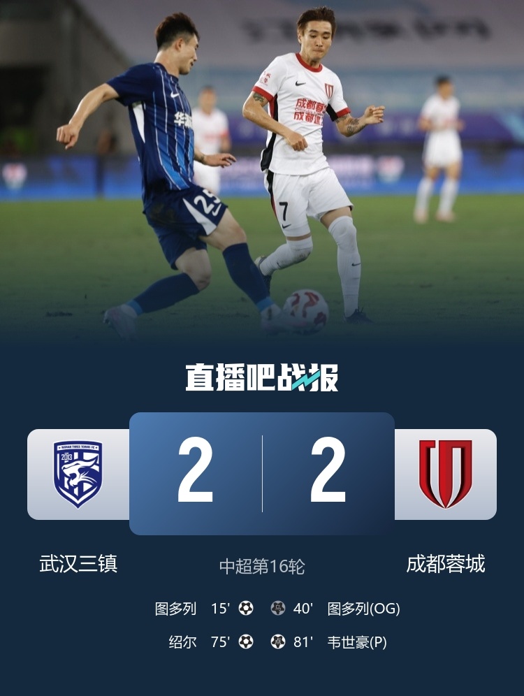 6月29日讯 北京时间19:35,中超第16轮武汉三镇vs成都蓉城,比赛在武汉体育中心体育场打响!上半场,图多列补射建功!半场尾声阶段又自摆乌龙!下半场,绍尔凌空落叶球击中横梁!周定洋错失绝佳机会;绍尔破门帮助三镇再次领先!王毅手球送点,韦世豪点射扳平&近3轮3球2助!最终,武汉三镇2-2战平成都蓉城,蓉城近4轮仅1胜。