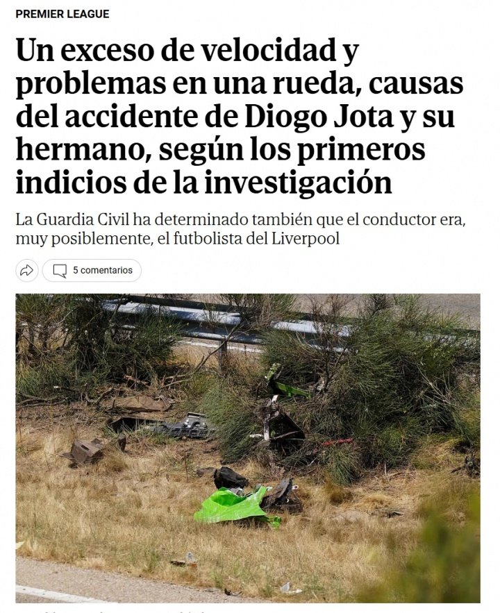 萨莫拉司令部交通旅的国民警卫队已经确定,迪奥戈-若塔及其兄弟安德烈-席尔瓦发生事故的最可能原因,正如最初所指出的那样,是车辆的轮胎问题以及超速。