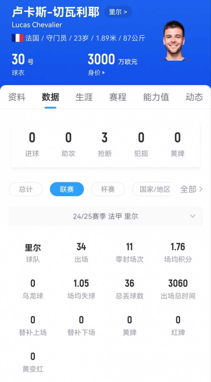 现年23岁的切瓦利耶上赛季为里尔在联赛出场34次,贡献11场零封。球员目前的身价为3000万欧元。