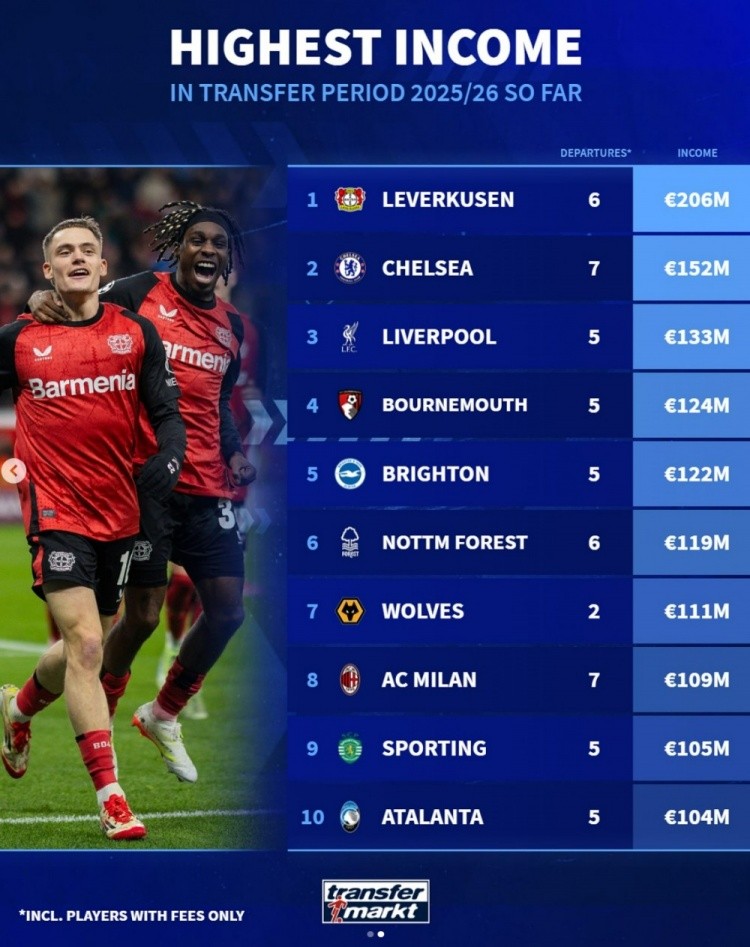 目前夏窗出售球员收入榜:勒沃库森居首,切尔西次席,红军第三