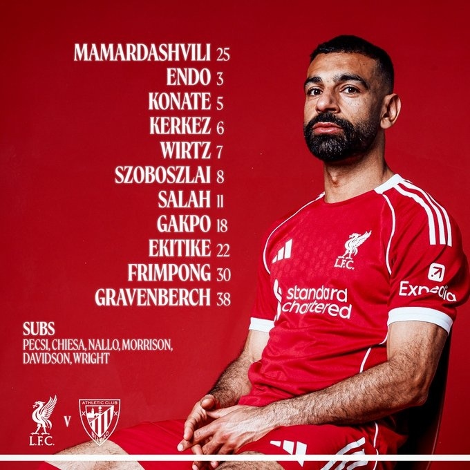 利物浦首发:25--玛玛达什维利、5-科纳特、6--科尔克兹、30-弗林蓬、38-赫拉芬贝赫、3-远藤航、7-维尔茨、8-索博斯洛伊、18-加克波、11-萨拉赫、22-埃基蒂克